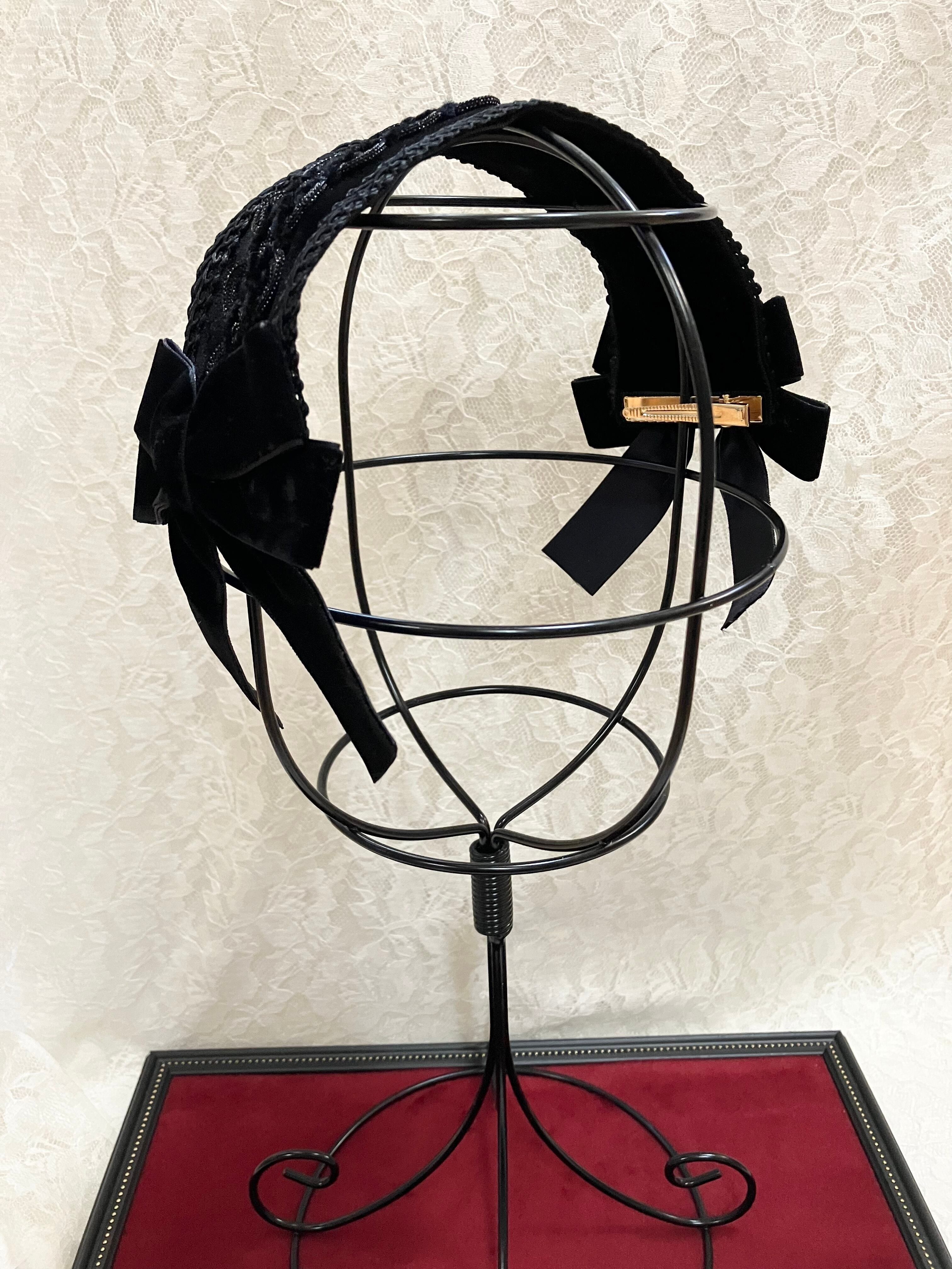 幅広のベロアリボンに二種類のブレードを合わせたクラシックな印象のヘッドクリップです。